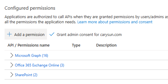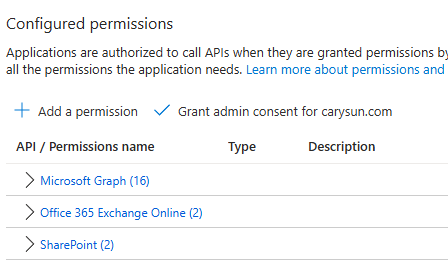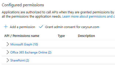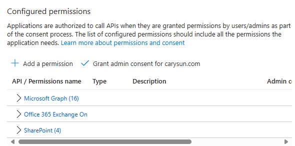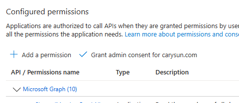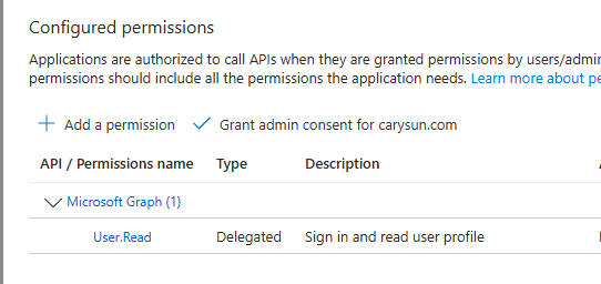 75. Click Grant admin consent for the domain name (carysun.com) on the Configured permissions page.