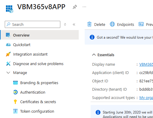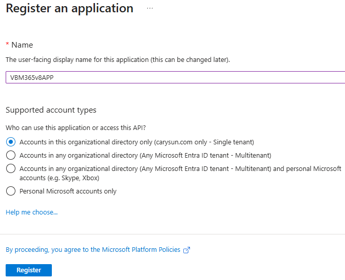 5. Enter VBM365v8APP as the application name on the Register an application page.