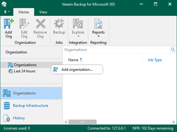 87. On the Veeam Backup for Microsoft 365 Console page, right-click Organizations and select Add an organization.