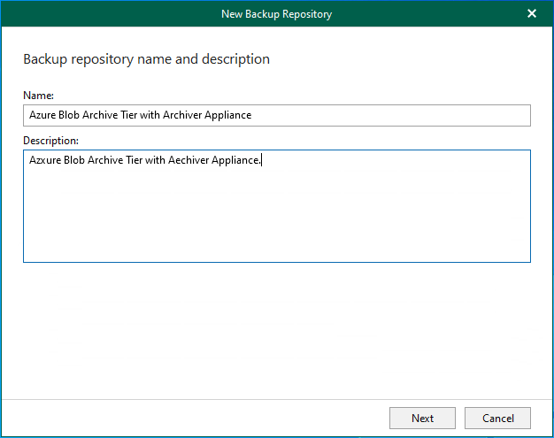 52. On the Object storage repository name and description page, type Azure Blob Archive Tier with Archiver Appliance as the Object storage repository name and click Next.