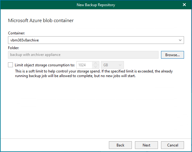 63. If you want to control the storage spend, select Limit object storage consumption, enter the storage size and click Next.