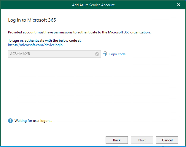 74. On the Log in Microsoft 365 page, click copy code and click the sign-in link.