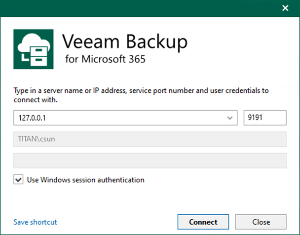 2. Open the Veeam Backup for Microsoft 365 console and click Connect.