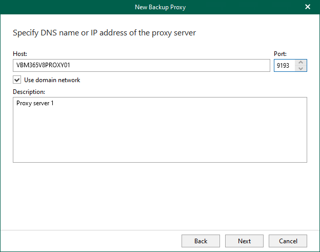 6. In the Host field, enter a DNS name or IP address of a computer you want to use as a backup proxy server, select Use domain network and click Next.
