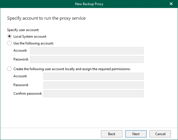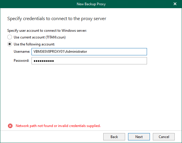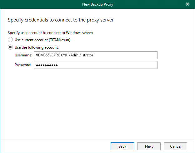 7. On the Specify credentials to connect to the proxy server page, select Use the following account, enter the user name and password and click Next. The account must be a member of the Local Administrator group.