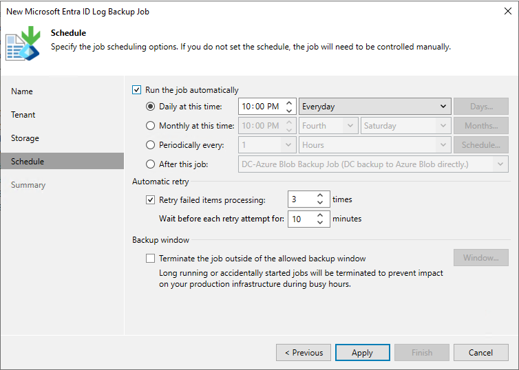 18. Define the time interval the backup job must complete in the Backup window section. The backup window ensures that the job does not overlap with production hours and that there is no unnecessary overhead on the production environment.