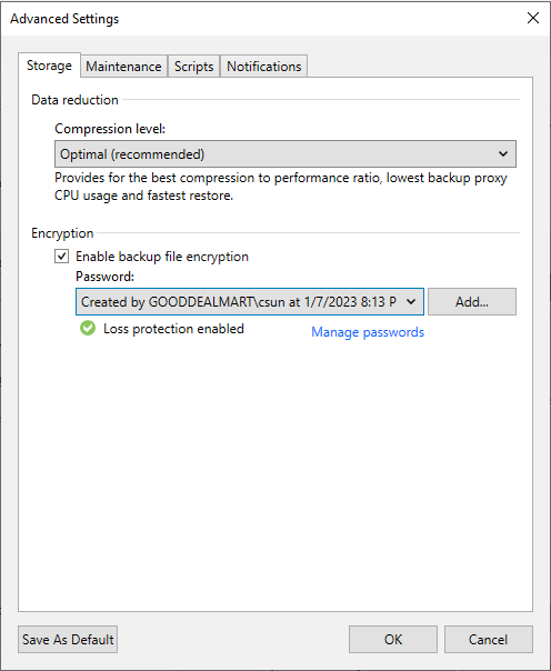 12. Select the Storage tab on the Advanced Settings page and select Enable backup file encryption.
