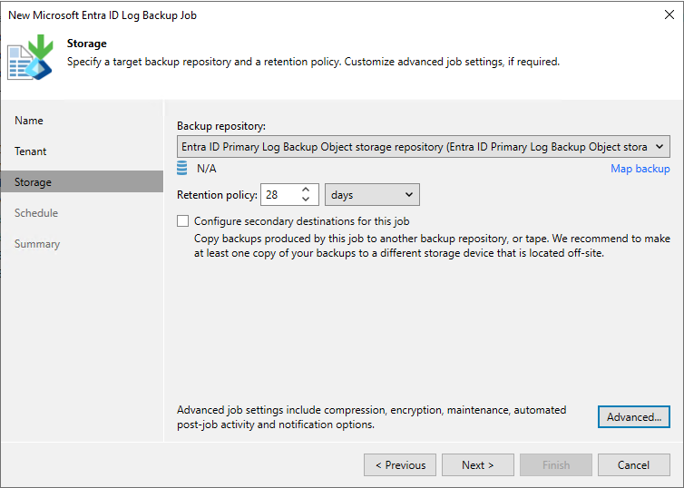 11. Enter the retention days in the Retention policy field and click Advanced.