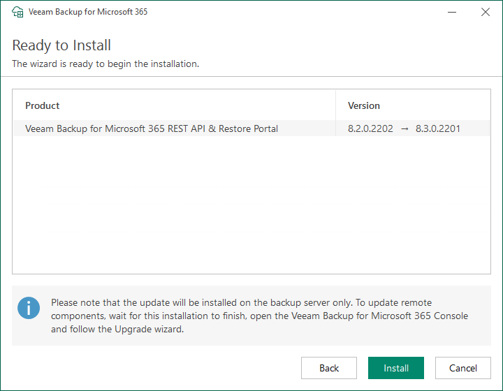 8.Click Update on the Veeam Backup for Microsoft 365 page.