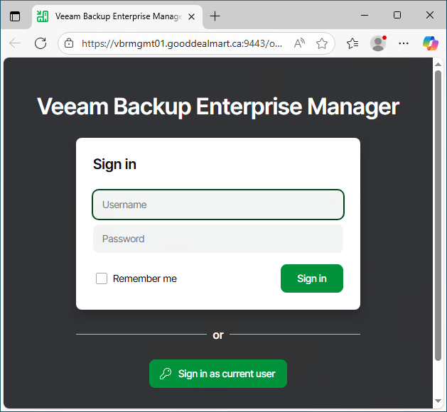 31.On the Veeam Backup Enterprise Manager Sign in page, click Sign in as current user (or enter the user name and password).